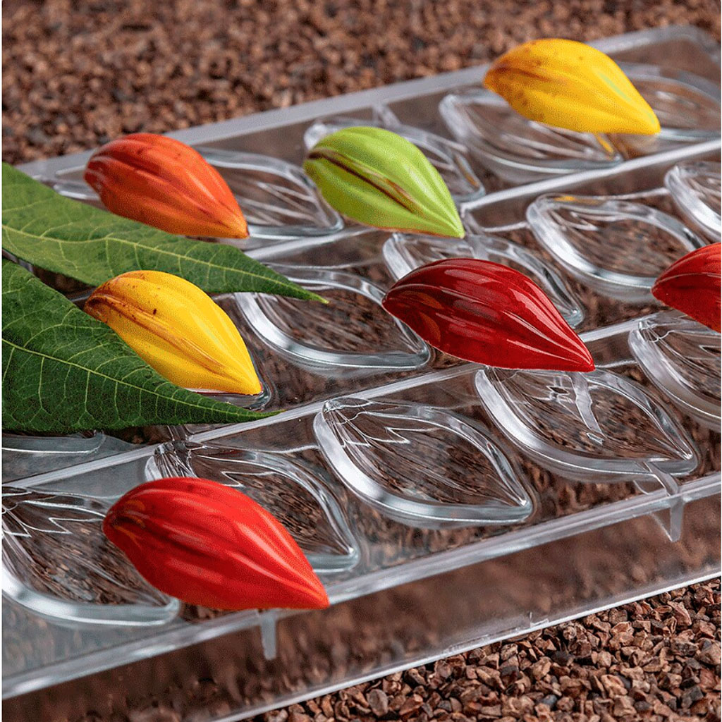 Chocolate mould for ‘Theobroma’ pralines in the shape of chocolate kabobs from the Cocoa line.