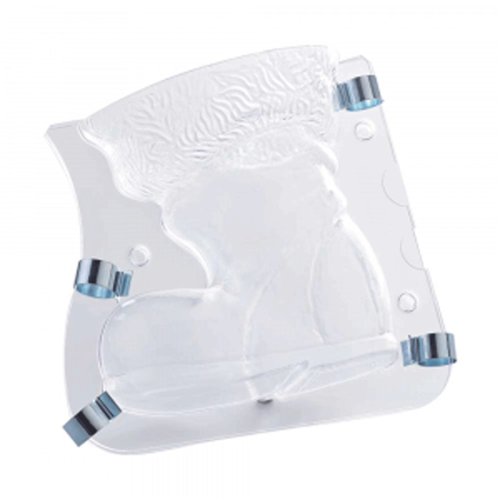 Rigid, thermoformed plastic mold for chocolate Christmas figurines, hollow body in the shape of a large boot. Includes spring clips for fastening.