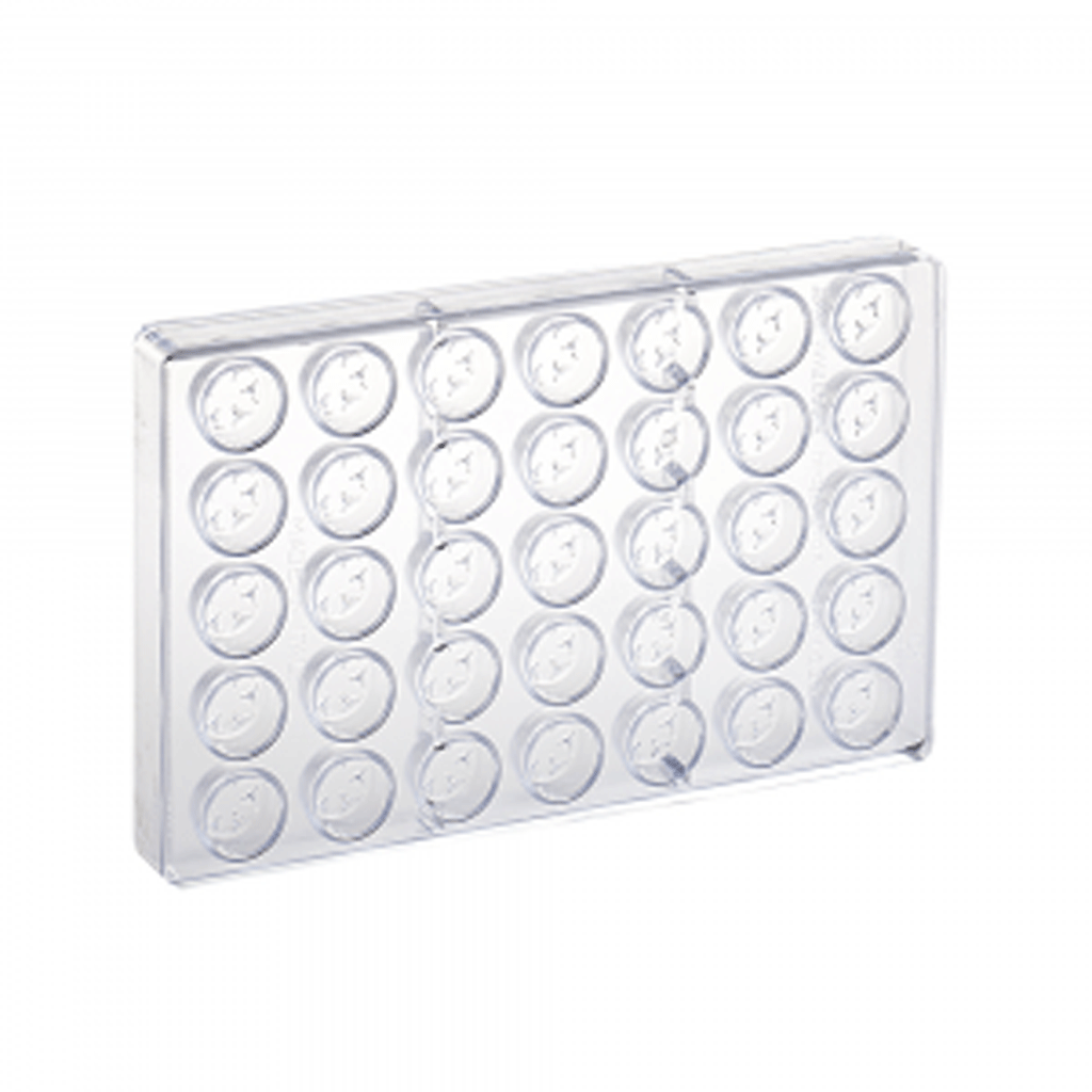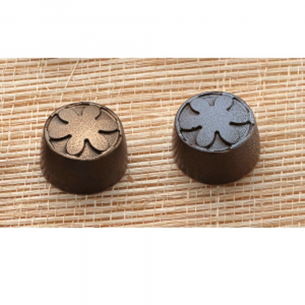 Chocolate mould for round pralines with flower decoration.
