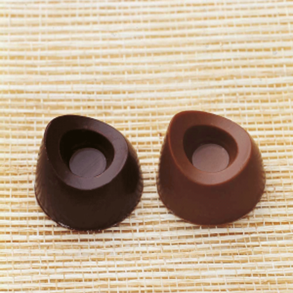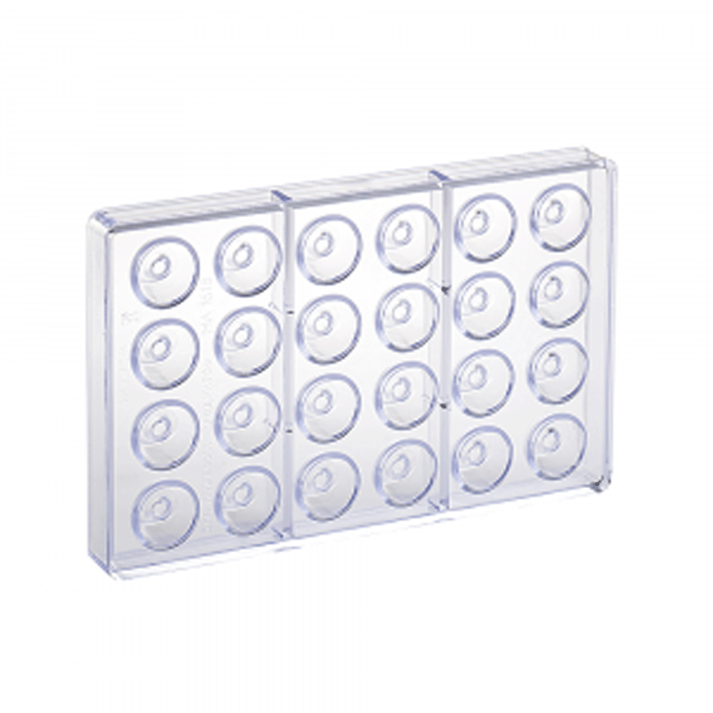 Chocolate mould for round pralines with central recess.