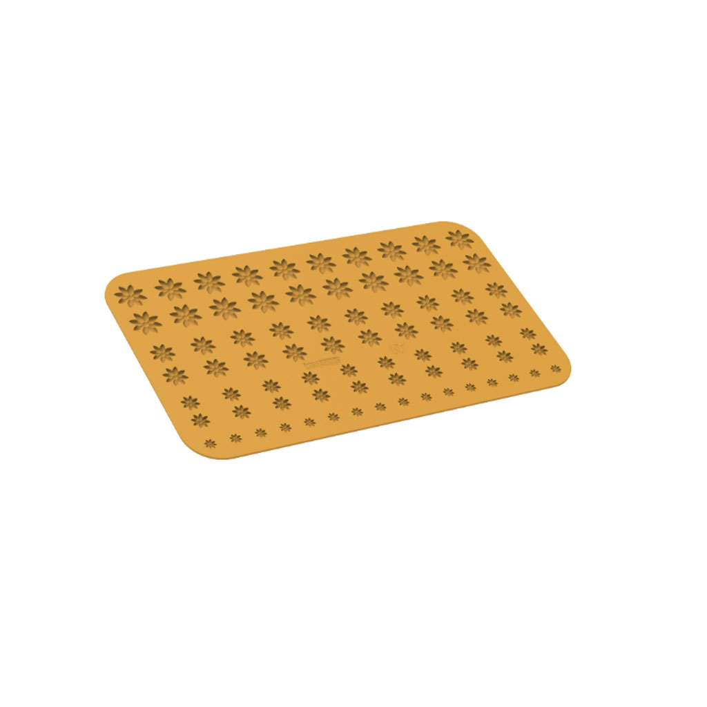 Margherita features four different sizes of daisies. This mat can be used with chocolate, jelly and even creamy preparations. It is useful for decorating hors d’oeuvres, dishes and main courses, for creating original appetisers or for adding a refined touch to plated desserts. You can also cut the silicone mat along the line for even more practical use. Conceived with Farid Azarang.