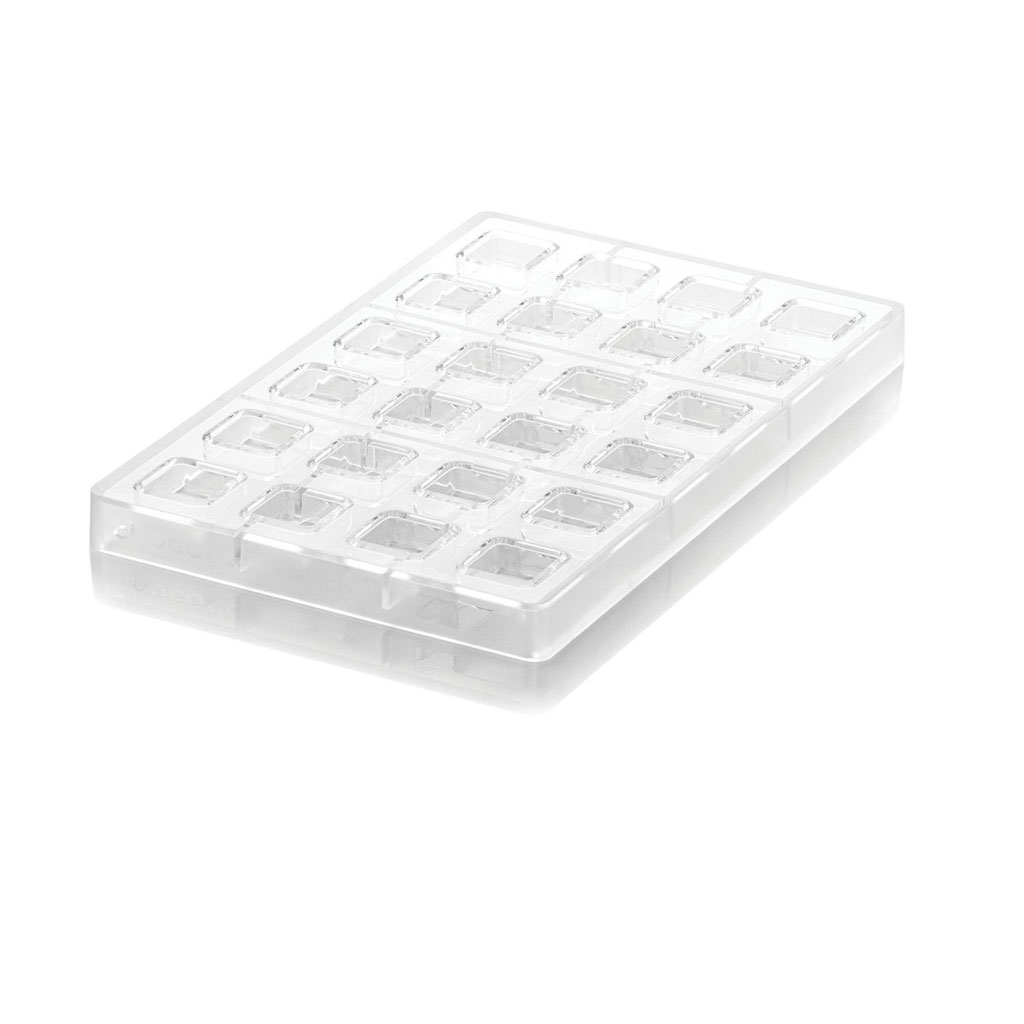 Tritan mould ideal for the creation of 24 perfect and shiny square pralines. 25×25 h 15 mm / 0.9×0.9 h 0.6”